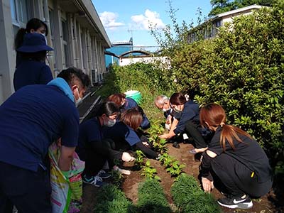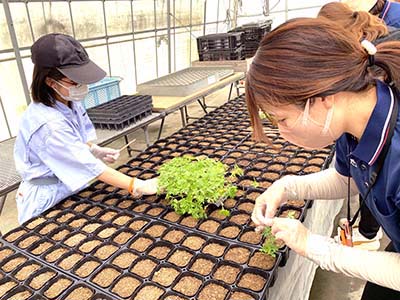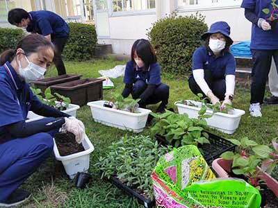 7月は、苗の鉢上げのお手伝いをさせて頂きました。また、8月はプラ鉢の中で育った苗を譲り受け、プランターや花壇などに定植しました。